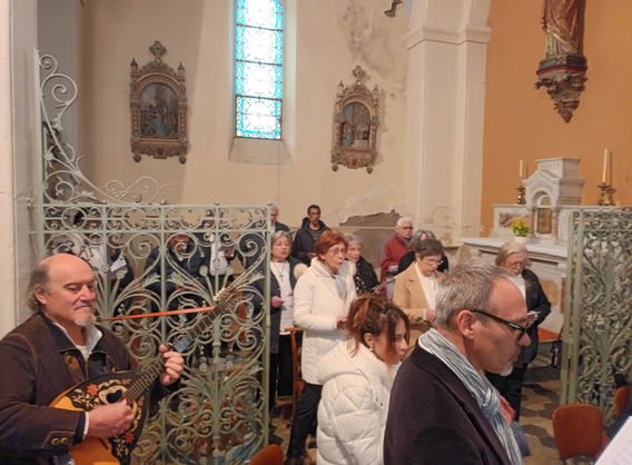 Le Père Albert a officié devant une fervente petite assemblée complétée par une arrière-assemblée observatrice et heureuse d'assister à ce moment unique dans l'année. L'animation était joyeuse, accompagnée par la guitare et la voix d'Élodie Sauvage de Saint-Florent-sur-Auzonnet et d'une chorale rassemblant plusieurs éléments de Saint-Ambroix, Meyrannes, etc.